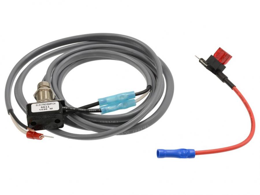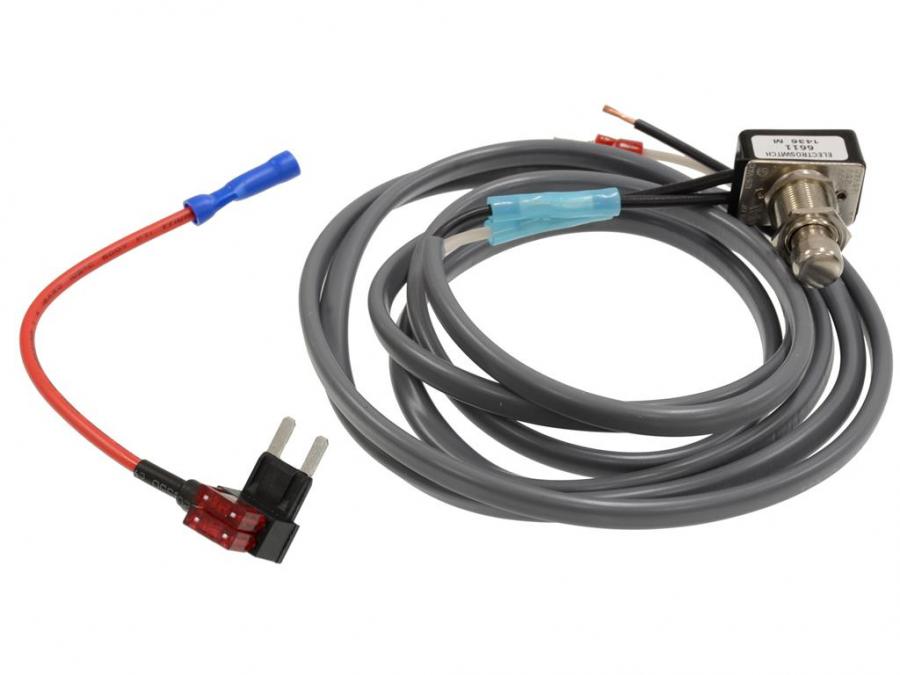 The kit includes a pre-wired heavy duty switch, stress relief block, and zip tie, special flat shielded cable, fuse taps and fuses, and special exhaust fuse bypass spade. 10 minute install. Tools needed: 10mm wrench, 1/2" drill bit.