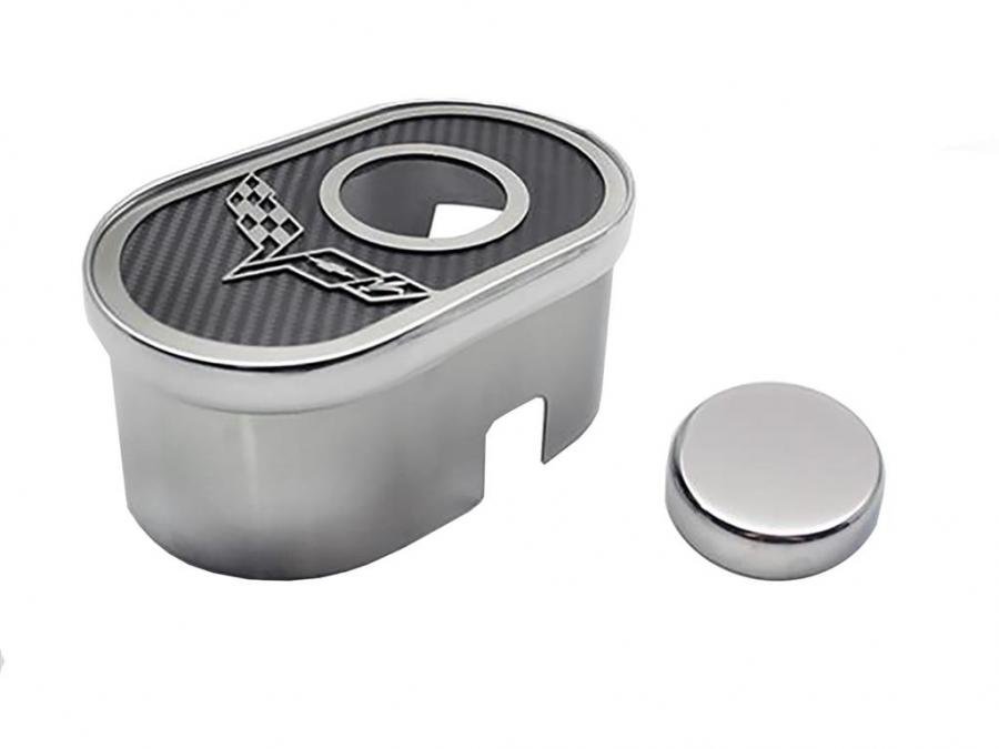This Polished Stainless Steel Master Cylinder Cover Carbon Fiber Crossed Flags includes a polished chrome cap cover and black fiber vinyl color inlay. Designed with style and with a precision fit, this part will enhance your 2008-2013 C6 Corvette engine. It fits directly over the brake master cylinder. No tools required.