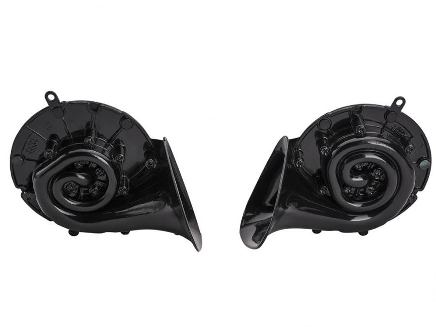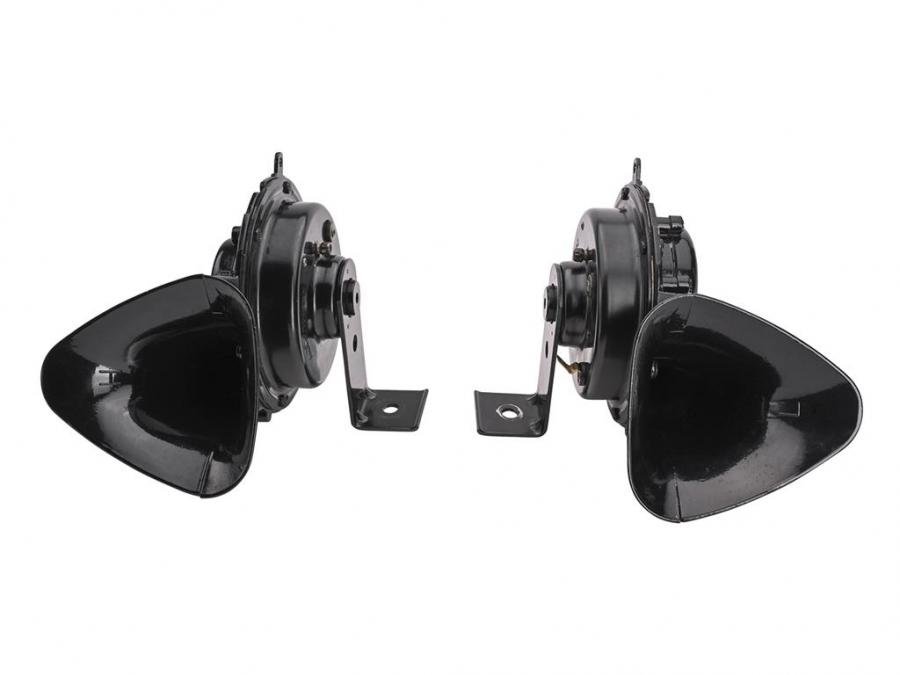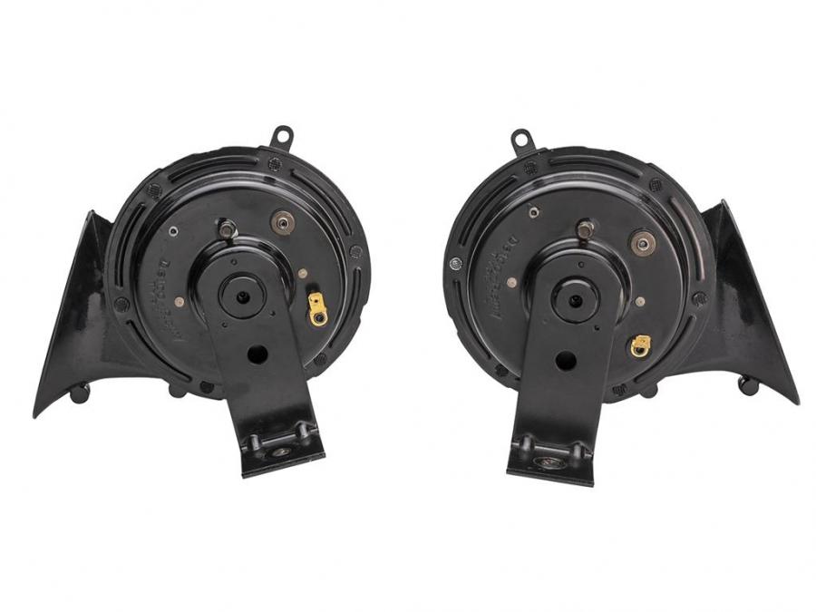 These reproduction horns feature "swirl" shaped housings with the "Delco-Remy" logo in the original font.rEach pair includes a high and low note horn.