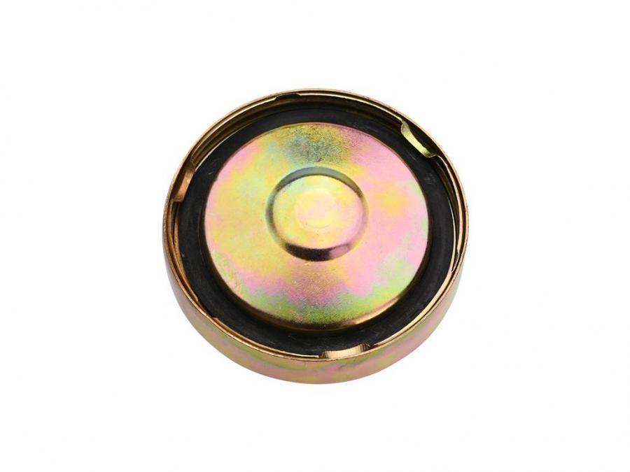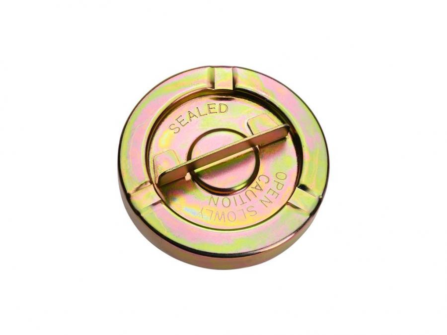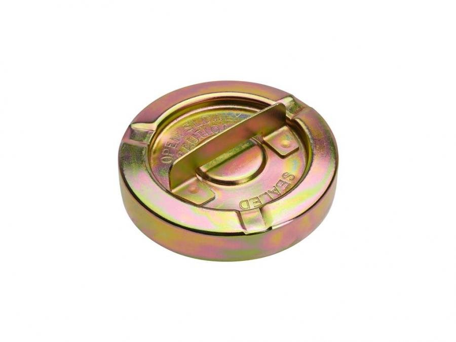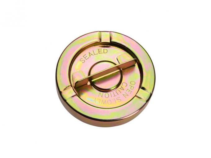 1970-1974 Corvette reproduction non-vented (sealed) gas cap. Gold Zinc plated as original. Cap has Sealed Open Slowly Caution stamped into the top