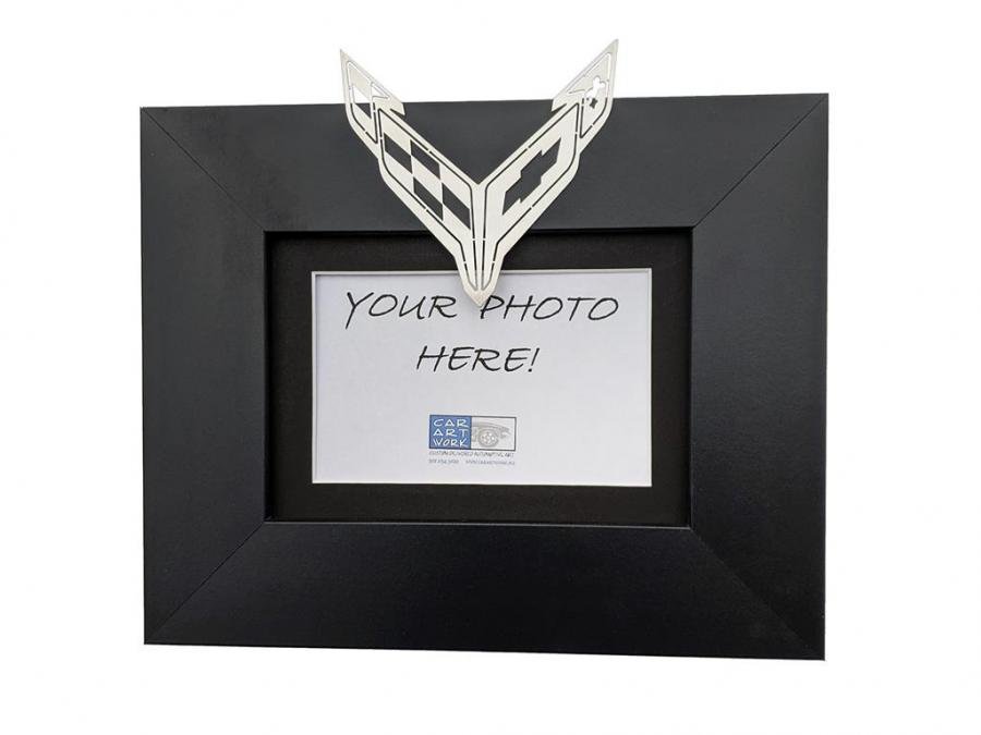 The C8 photo frames are black wood embellished with a brushed stainless steel emblem. They're a wider frame to accommodate the taller emblem. The frame will accommodate a 4x6 photo with the mat or a 5x7 photo with the mat removed. Fold-out easel and hanging hardware attached.