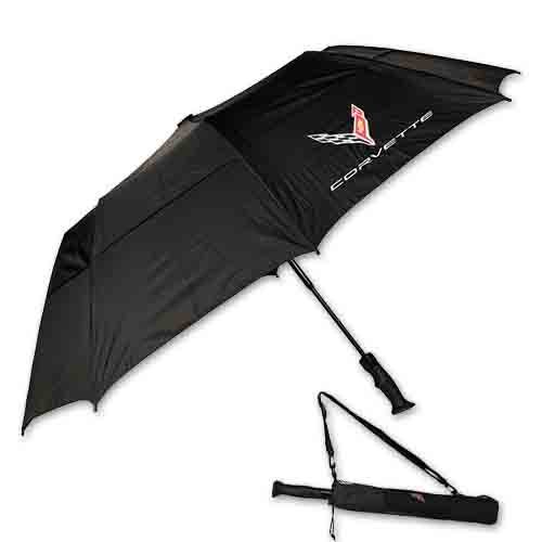 2020 CORVETTE GOLF UMBRELLA 58” Arc, Folding Golf Umbrella, vented design, fiberglass shaft, double rib construction, auto open. Color: Black