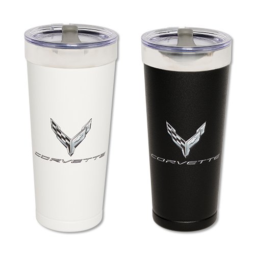 2020 Corvette Metallic Tonal Tumbler Double wall 18/8 stainless steel thermal tumbler with copper vacuum insulation, high polish accent, clear acrylic push-on swivel lid and powder coated finish. 2020 Corvette metallic tonal logo. Size: 20.9 oz.