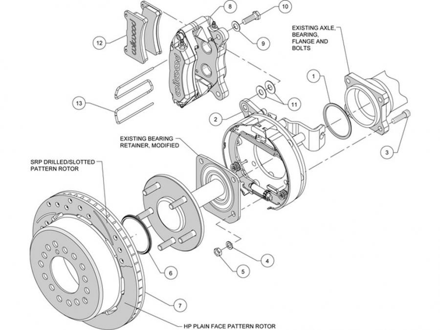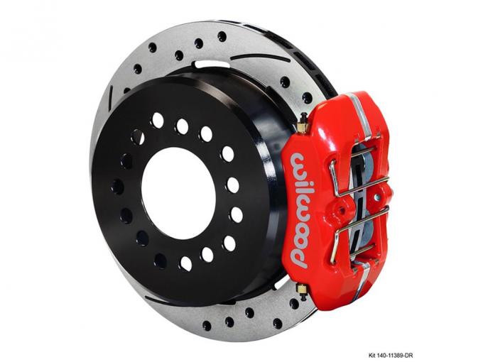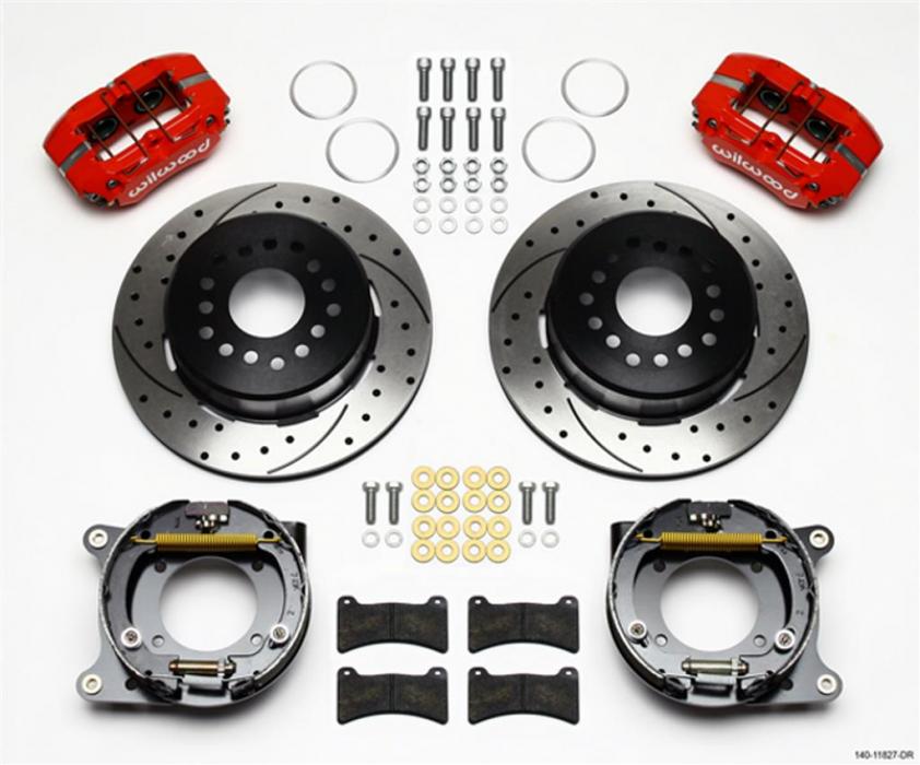 Forged Dynapro Low-Profile Pro-Series rear disc brake kits provide a complete solution for popular C1 rear axles that require a parking brake assembly and extra clearance 15" rim applications. Forged billet Dynapro Low-Profile 4-piston calipers 11" 1-piece hat and rotor assemblies, and high friction pads provide optimized and balanced braking for all types of custom performance street/strip and show machines. The neatly hidden internal shoe system provides a clean installation with superior static holding power for parking.