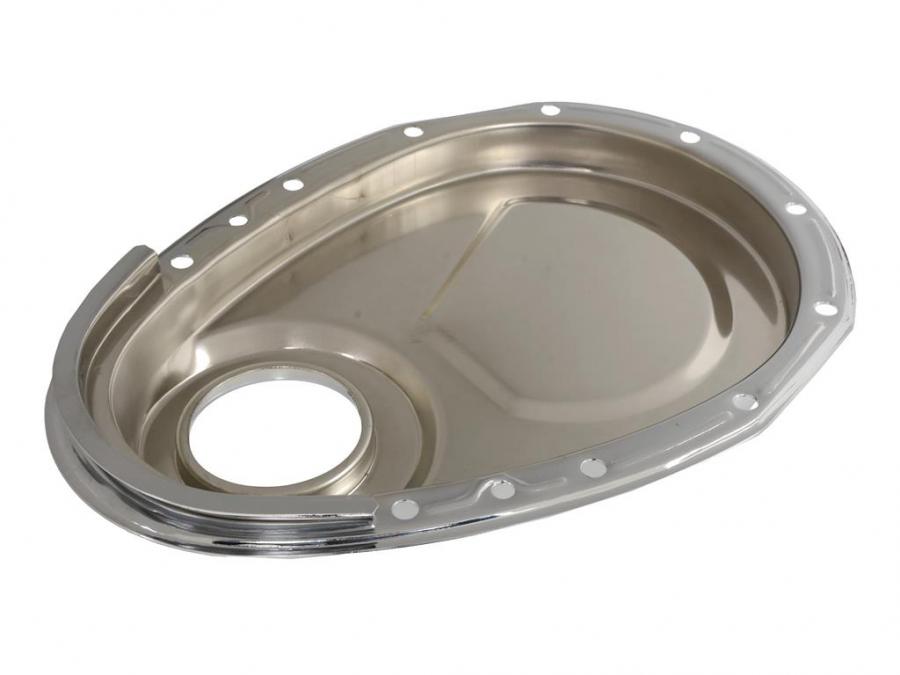 Chevy small block timing chain cover set includes chrome steel timing chain cover, chrome steel timing tab, bolts, seal, and gaskets. Fits Chevy 283-305-327-350-400 small block engines. For use with nylon cam button running a roller cam. NOTE: Will not work if you are using gear drive timing chain. NOTE: May require extra gasket thickness or shim under short pump to clear cover.