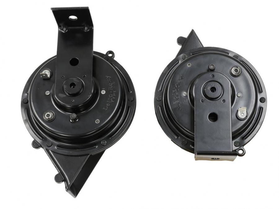 These exact reproduction horns feature "swirl" shaped housings with the correct "Delco-Remy" logo in the original font. Direct fit applications feature the correct mounting brackets installed on the assemblies. Each pair includes a high and low note horn.