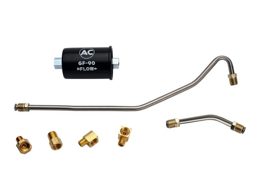 Black as original GF90 filter with Stainless Steel lines> Pump to carburetor. Gas lines are steel tubing with double inverted flares and steel nuts, same as OEM. All are prebent into exact shape as original. Some models are chrome plated as indicated.