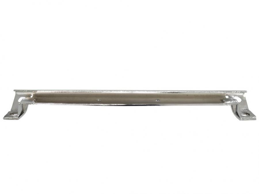 The front bumpers are joined together by a chrome plated steel cross brace bumper bar that holds the front license plate bracket. Length = 19 1/2 inches.