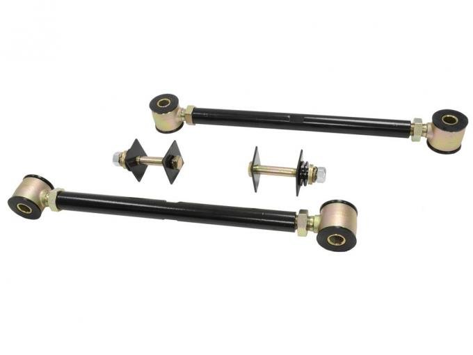 These Strut Rod Kits with Urethane Bushings eliminate the stock adjustment cam bolt system that often allows the rear tires to "lean in" at the top and cause premature tire wear. Once you lock in the camber setting, it will stay put and give you smooth, predictable handling. New rugged plating resists corrosion. Includes mounting hardware.