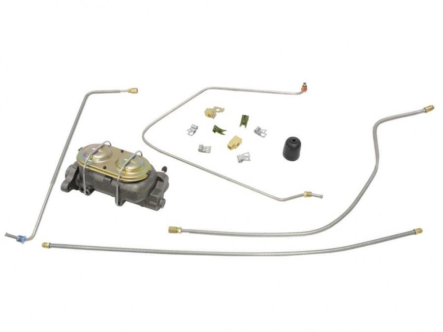 A no-hassle way toinstall a dual-reservoir master cylinder on your 1965-'66 Corvette. Includes a two-piece stainless steel line kit that uses no adapters. Two stainless steel lines, two brass junctionblocks and their new master cylinder convert your power brake Corvette to a "safe" dual circuit brake system. When you are finished, your car will look as close to stock as possible without the gaudylook of adapters and rigged brake line.