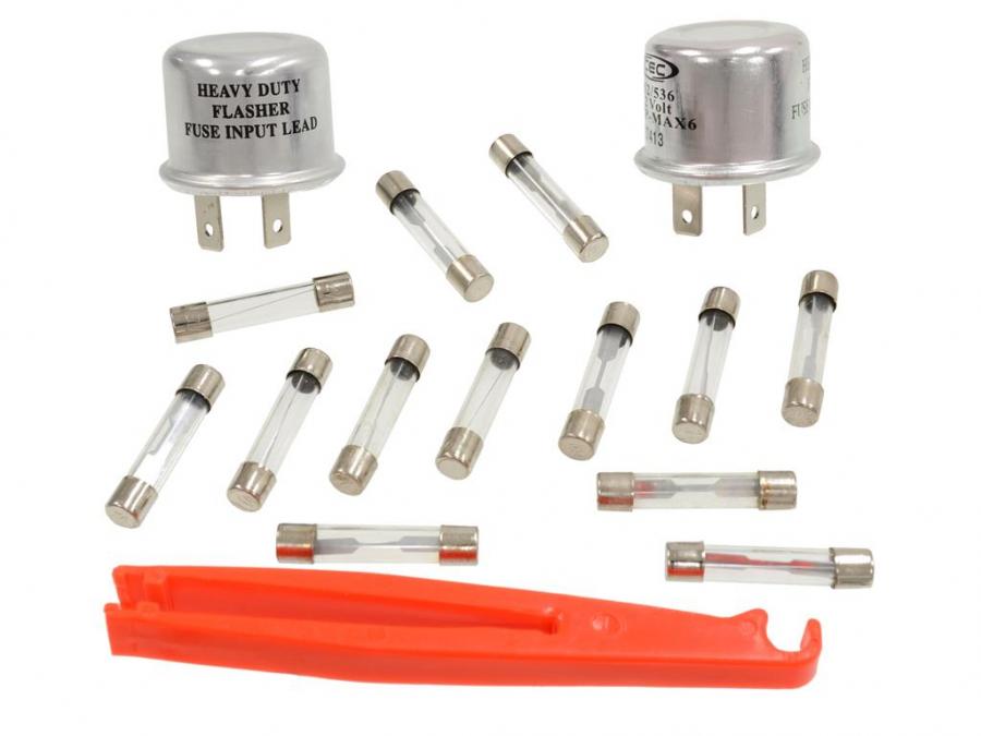 These kits are a must for anyone installing a new dash harness in their car or those who might run into trouble on the road. Kits include all the fuses and the flashers required for an initial installation, and a fuse removal tool is also included.