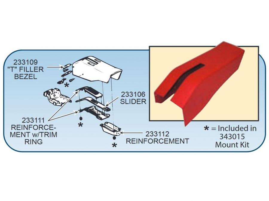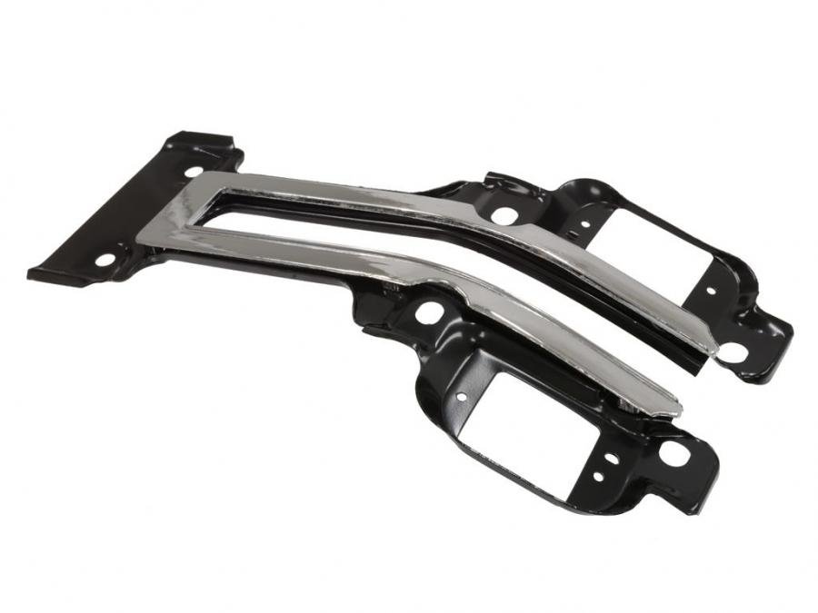 Stamped steel emergency brake console reinforcement. Painted black with a chrome plated die cast trim ring that guides the parking brake handle platic slider.