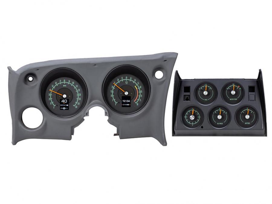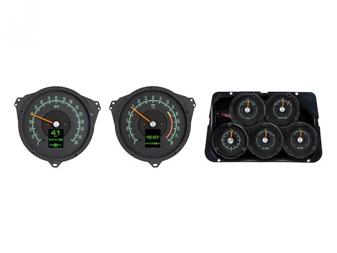 Bolt-in upgrade! You’ll use your stock instrument rear housings and front bezels, but the clear lenses and world-class instrumentation is included. A decidedly original look infused with twin TFT message center that can be fully configured to display just about any piece of information needed, and thanks to the technology inside, mating this package to a late-model drivetrain is simple! Designed for 1968-77 Corvettes, and includes clock.