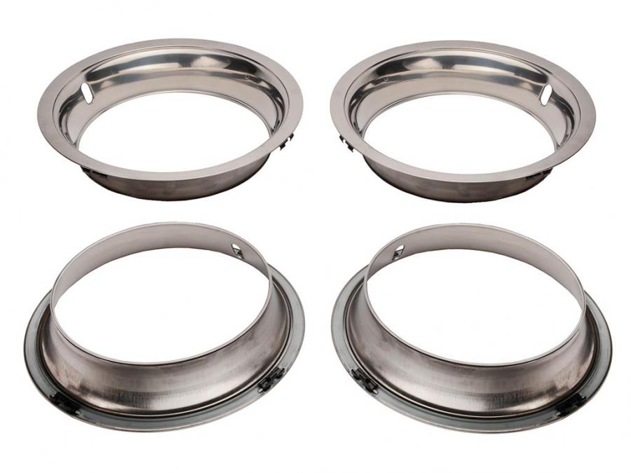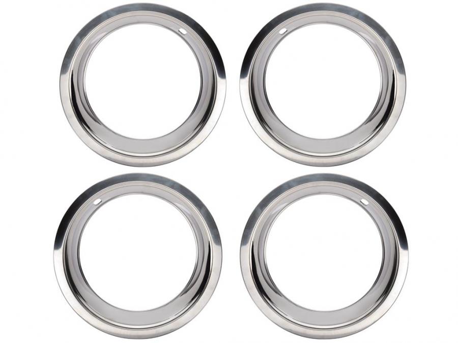 Set of 4 polished stainless steel C3 Corvette 8" Rally Wheel trim rings. Correct reproduction with stepped edge and 4 retainer clips with plated reinforcement ring, just like the OEM rings.