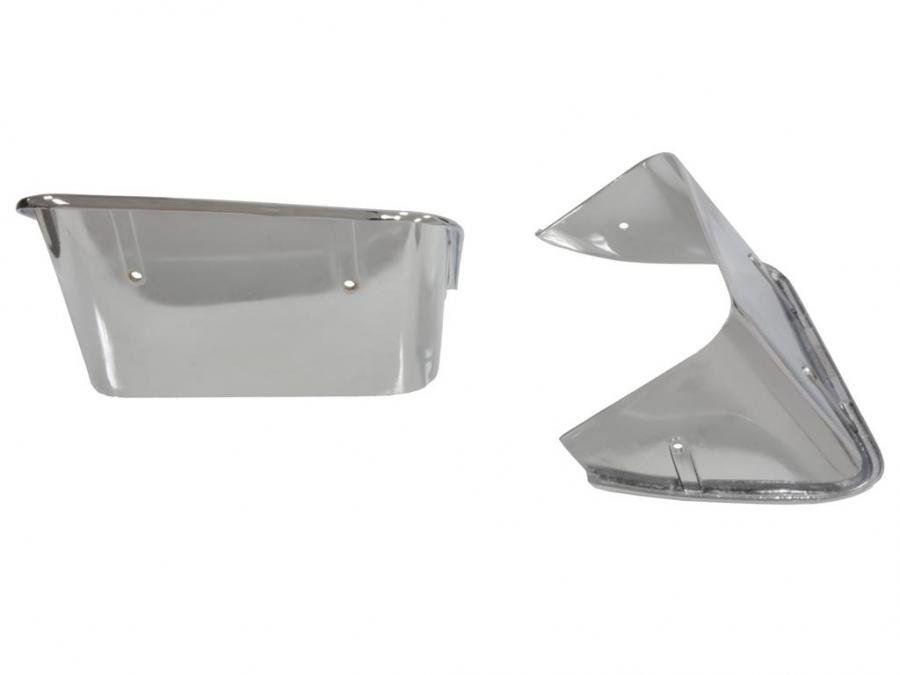 These 1970-73 Exhaust Bezels are rectangular, Chrome plated die-cast metal open at the bottom. The sides and upper edge are rounded to produce a bead where bezel meets the fiberglass.