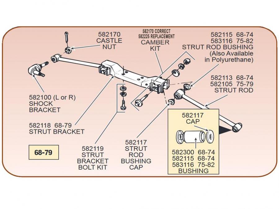 2 bushings required per strut rod, you will need 4 of these to do both strut rods and adjust your camber. O.D. = 1 3/8", length = 1.672"