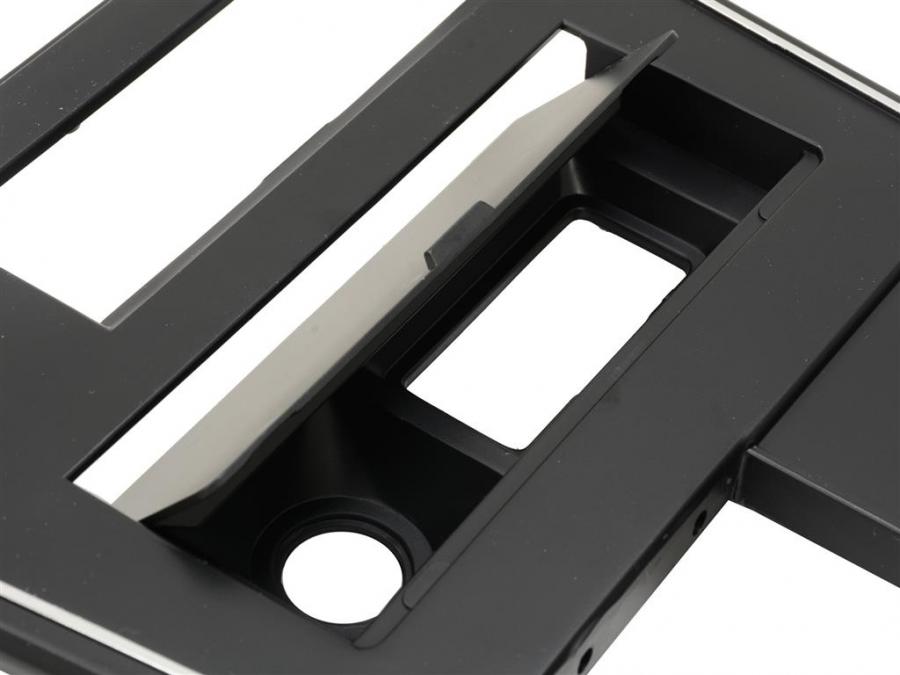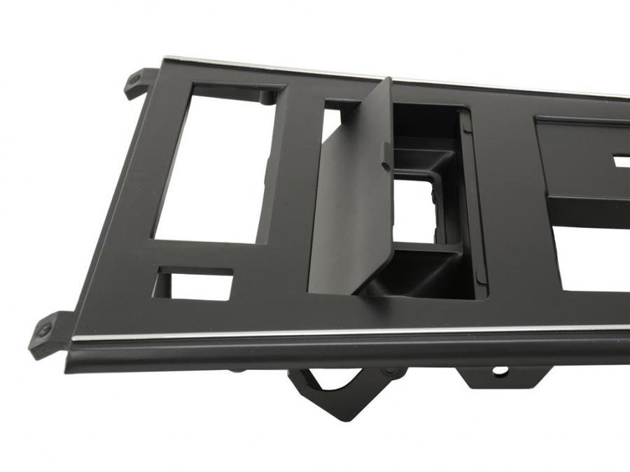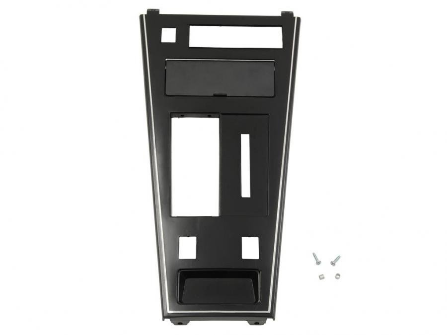 This black molded plastic automatic or 4-speed shifter front console trim plate with chrome edge trim is for 1977-1980 Early Shifter Console with Power Window and Rear Defrost and with Ashtray Door installed.