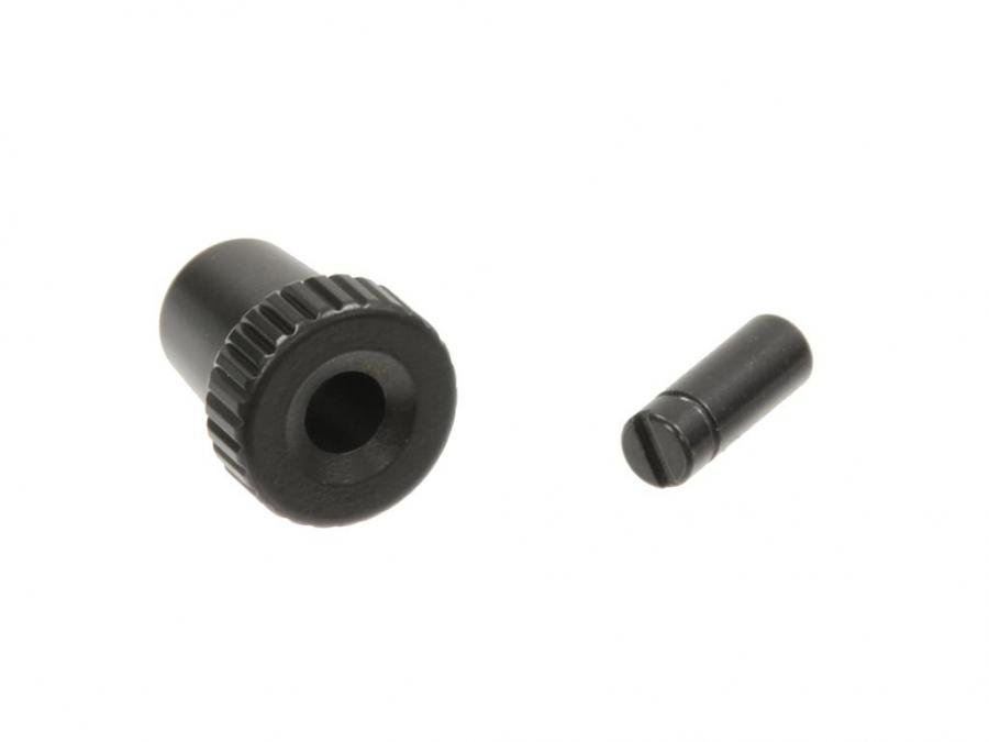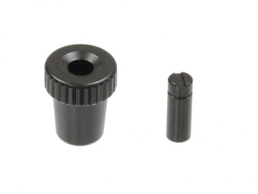 Black reproduction short diecast black painted clock stem adjusting knob, used on C3's with the plastic center console. Includes barrel nut for installation.