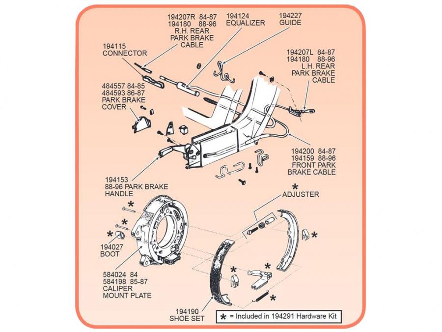 1984-1996 Corvette Parking Brake Cables and Hardware to replace those worn or stretched out cables and broken hardware. SheathedStainless Steel cable resists rust and corrosion for years of trouble-free performance.