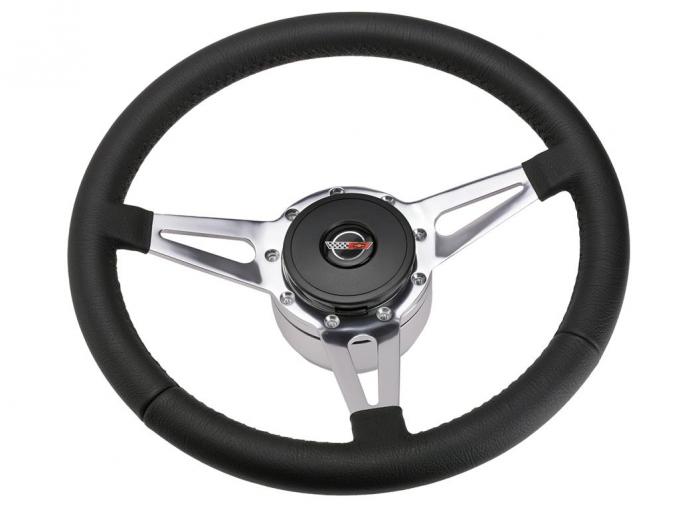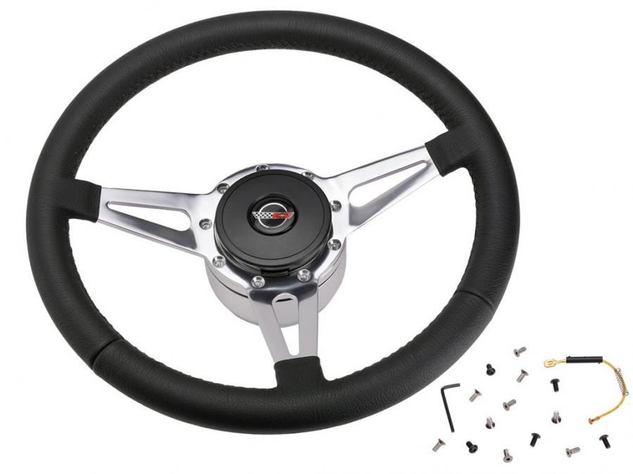 Conversion kit includes steering wheel hub adapter, horn button with 1984-1986 C4 Corvette emblem, hardware and horn contact wire.