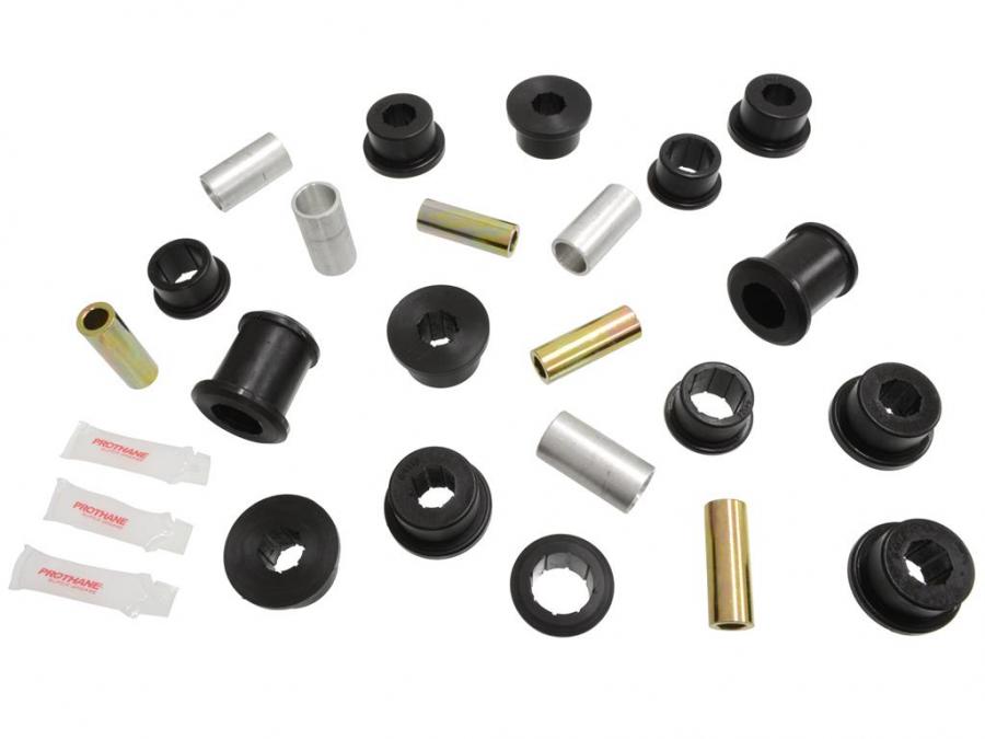 Polyurethane, unlike rubber, are not molded to the steel outer shells. Instead of twisting like rubber, the bushings are free to rotate on sleeves like a bearing. This means the suspension cannot bind and become full floating, resulting in longer life and improvedhandling. Polyurethane construction withstands oils, ozone, salt, and other corrosive chemicals. All bushings are pre-lubed with graphite to inhibit wear and squeaks.