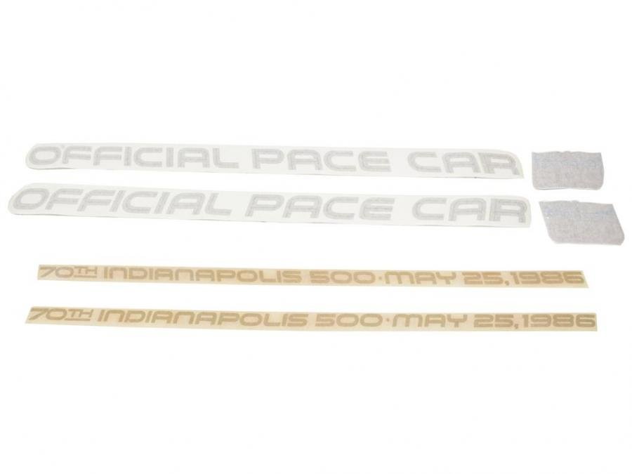 Complete kit consists of left & right hood badges plus 2 70th Indianapolis 500, May 25th 1986 and Official Pace Car door logos.