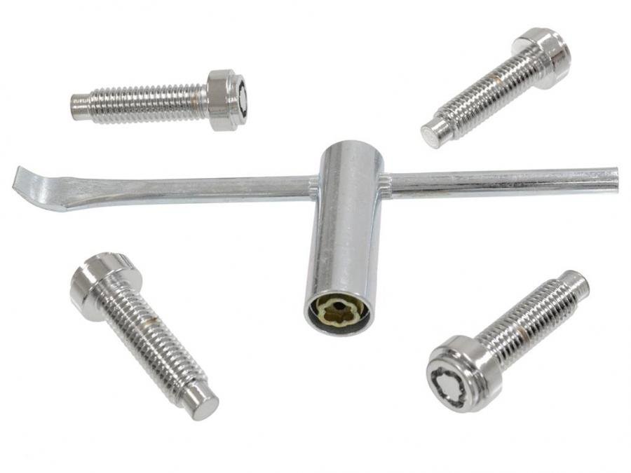 Reproduction of the original style wheel center cap locks with the correct key tool, for 1988 to 1989 Chevrolet Corvettes. While the lock bolts can become damaged over time, the most common problem is losing the original key. The head of the lock bolts would then have to be drilled out to remove them, but with no replacement lock set available, a plain bolt would have to be used to keep the center cap on.