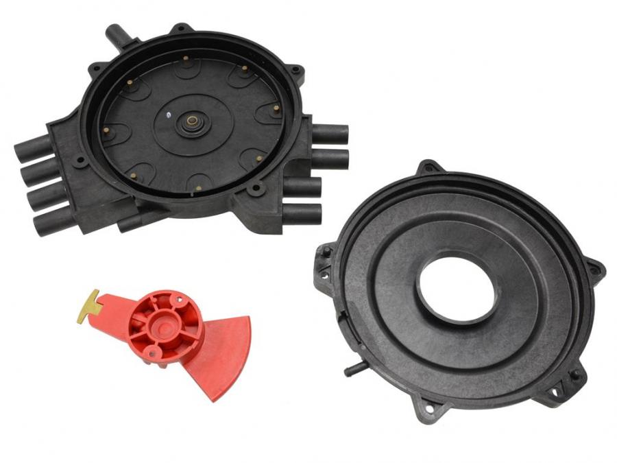 The all-new cap housing is injection molded from a special Dupont material that provides extreme strength and high dielectric properties resulting in less chance of breakdown causing a misfire. The terminal paths are encased in a durableepoxy compound for even more protection. The rotor is also an all-new molded piece with a brass/stainless rotor trio design.