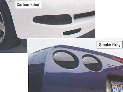 Highly polished smoke gray acrylic or carbon fiber lens install over existing tail lights and turn signals for a black-out look when lights are not in use. When lights are on, however, they can easily be seen. Front lenses snap into place and rear are held on by Velcro - requires no drilling or modifications. Check local laws before ordering.