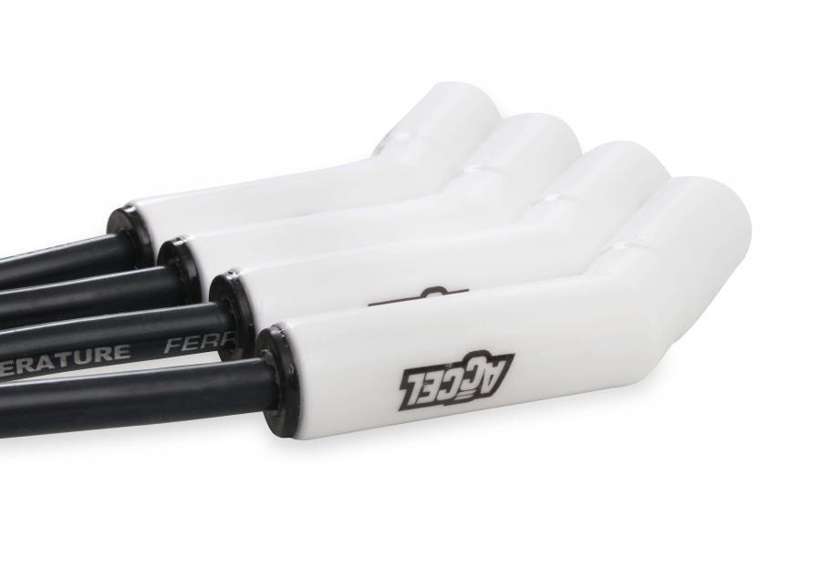 ACCEL now offers the cure for burnt spark plug wire boots with Extreme 9000 Ceramic Wire kits. The 8mm Ferro-Spiral core wire now has ceramic boots on the spark plug end of the wires. The ceramic boots will withstand up to 2,000 degrees F. If you are running headers with close tolerances, have an engine bay with little room or an RV with boots that melt because of heat, these wire kits are the answer for burnt and melting boots. The wire uses a 500 Ohms/ft Ferro-Spiral core developed for performance use. It provides excellent energy delivery to the spark plugs, while providing the highest level of RFI/EMI suppression. The Extreme 9000 Ceramic Wires also feature stainless steel spark plug terminals for maximum spark energy to the plugs.