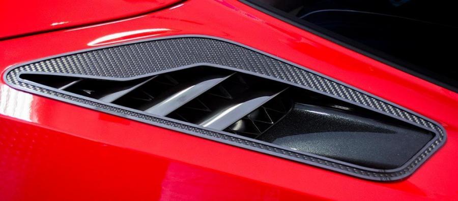 Dress up your C7 Corvette Stingray with our 2 piece Rear Quarter Vent carbon fiber with stainless steel trim set. These pieces are designed to fit all 2014+ Corvette Stingrays over the rear quarter panel vents and add a unique look to your Corvette exterior.