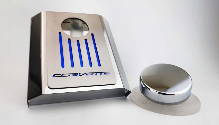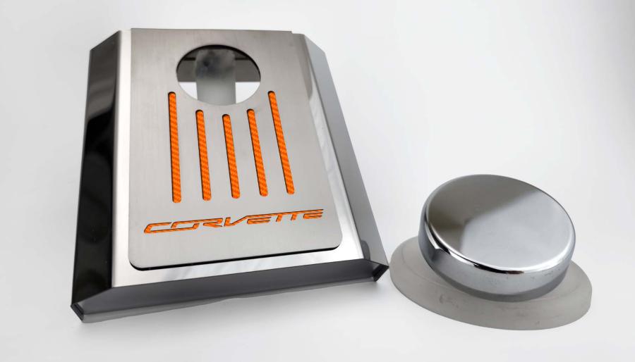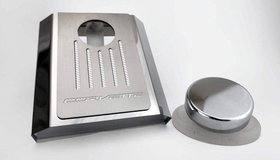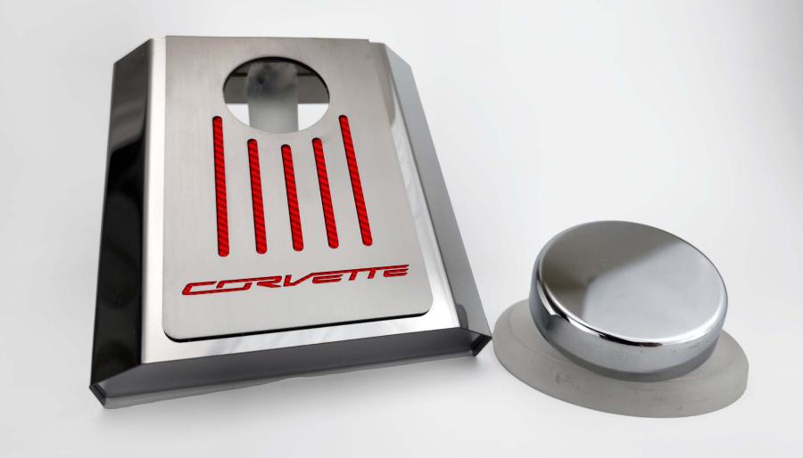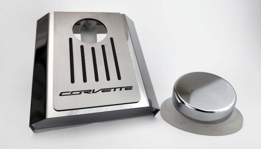 Enhance your C7 Corvette's engine bay with the polished stainless steel Automatic Master Cylinder Cover with Top Plate in Corvette Style from American Car Craft. This officially licensed premium polished stainless steel master cylinder cover and brushed ribbed top plate cover features a Corvette flag style design. Each product is meticulously crafted from 100% stainless steel with a mix of polished and brushed finishes that radiates style and durability. Its premium vinyl inlay is available in your choice of color to match your C7 Corvette's aesthetic. With its easy installation and custom design, this cover is the perfect addition to your collection of stainless steel accessories. Like all American Car Craft products, the Master Cylinder Cover with Top Plate combines impeccable design with the classic look of carbon fiber for a unique, high-quality finish.
