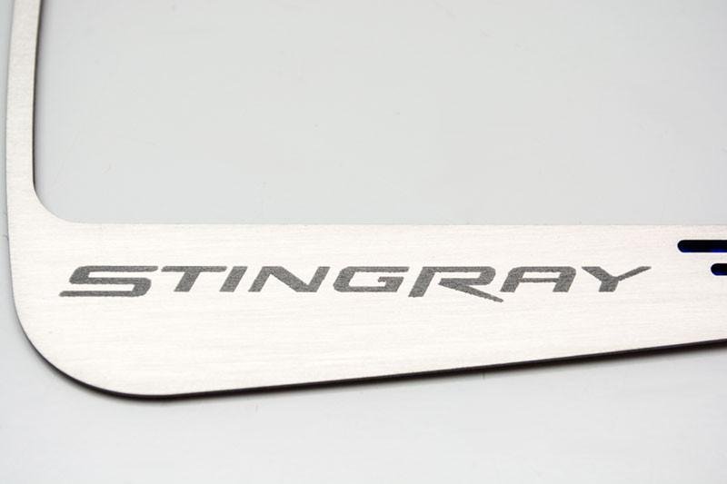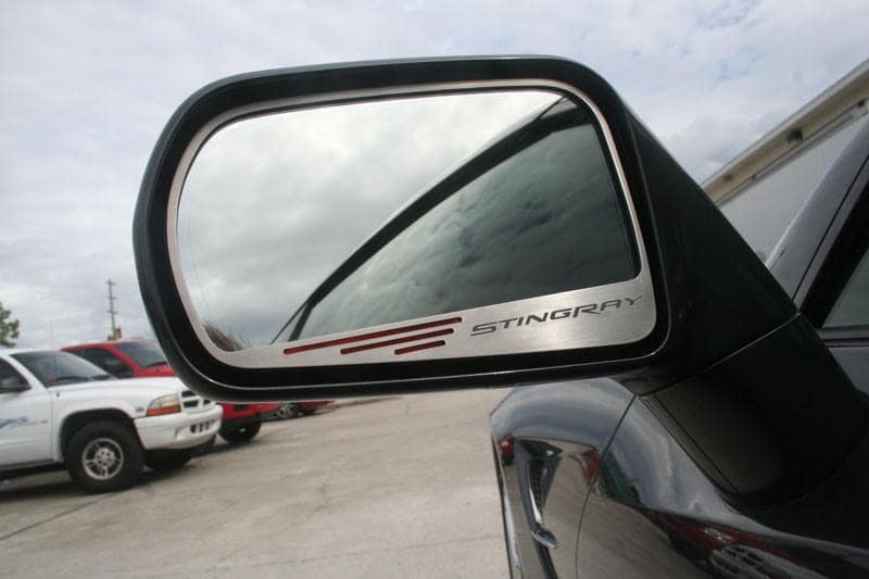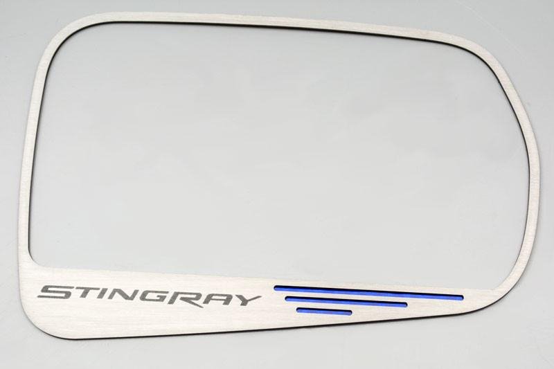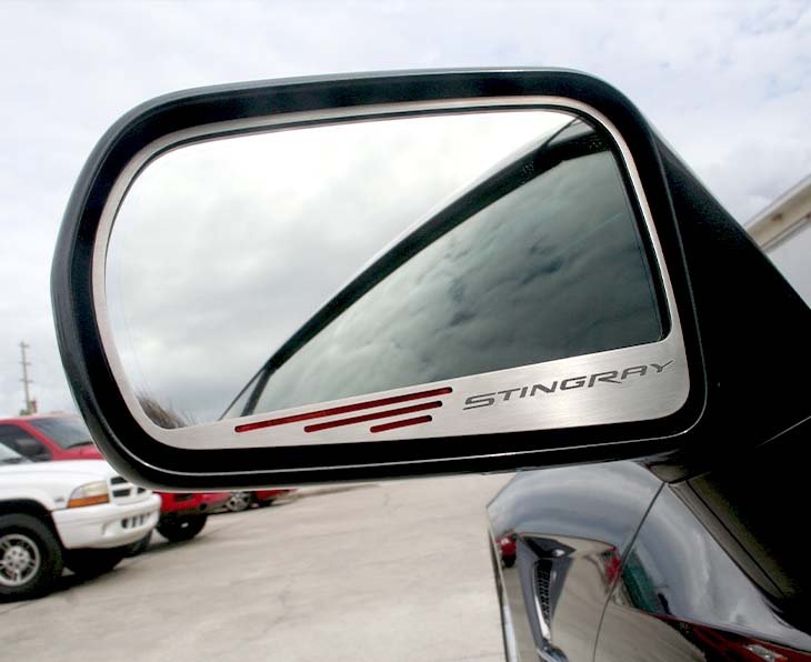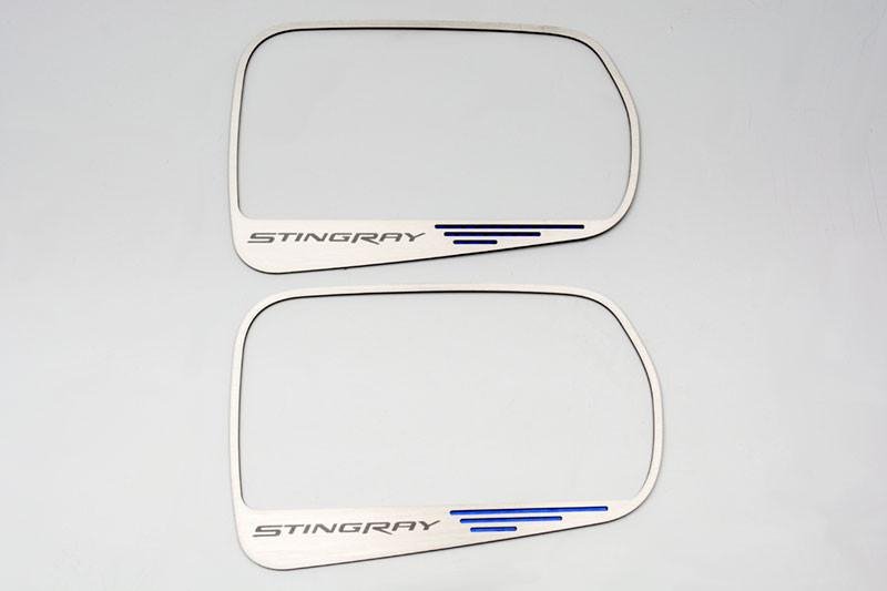 Dress up your Stingray Corvette C7 with our satin finish stainless steel Side View Mirror trim with etched "Stingray" Lettering. These trim pieces are designed to fit within the outer frame of the side view mirror. Choose a color inlay for laser cut line elements.