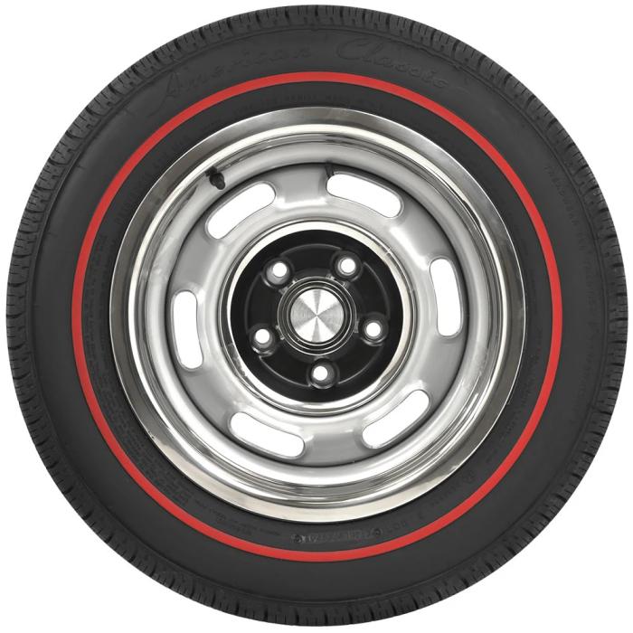 This product features a genuine redline sidewall style, sometimes known as a red stripe, due to the thin 3/8-inch strip rubber. This means that the red rubber is added directly to the tire sidewall during initial construction of the carcass, resulting in a truly integrated, high-quality product after vulcanization. Redline tires hit the American automobile market in 1964 with the introduction of the Pontiac GTO and remained a popular muscle car tire until around 1970. Dual redline tires (two red stripes) were an option on Ford Mustangs, and are now reproduced in original bias ply, bias look radial as well as radial construction. Choose the redline that best fits your application.