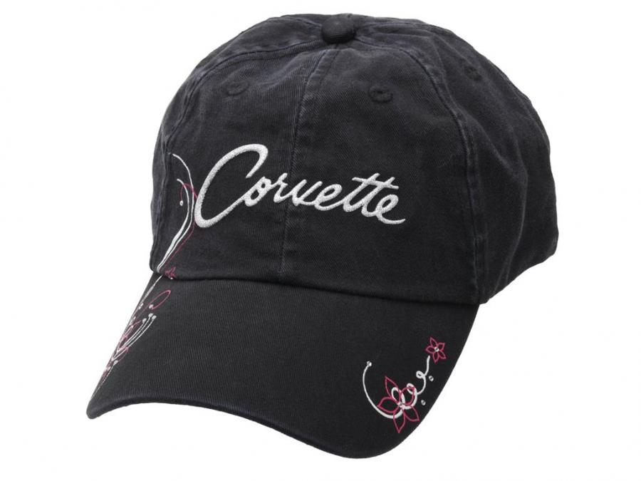Our black Corvette logo caps feature filigree trim accented with rhinestones and center located sparkle fleck Corvette logo. Cloth adjustable strap with metal buckle closure.
