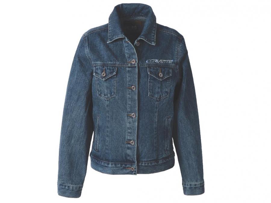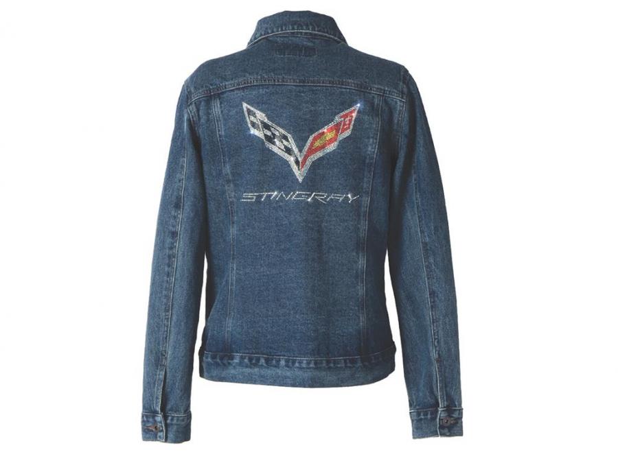 C7 Corvette Stingray Denim Jacket for ladies features a gently contoured silhouette. Two button-through flap chest pockets on the front and button cuffs. C7 Corvette Stingray Rhinestone script on front left chest, C7 flag and script rhinestones on full back.