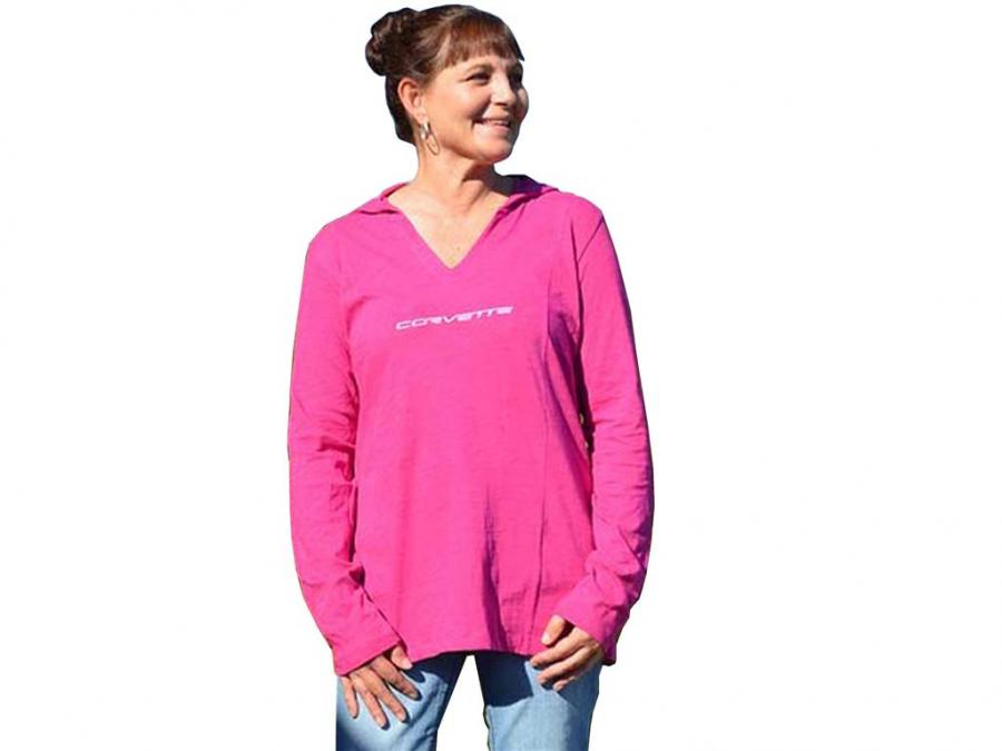 100% cotton slub jersey. V-neck with hood. Princess seams with side seam pockets. 28" tunic length. Features tonal floral design with distressed Corvette Script.