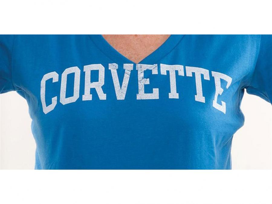 Champion 100% cotton lightweight Jersey V-neck Tee. Arched Corvette lettering across the front in a distressed screen print give this shirt a young, modern feel.