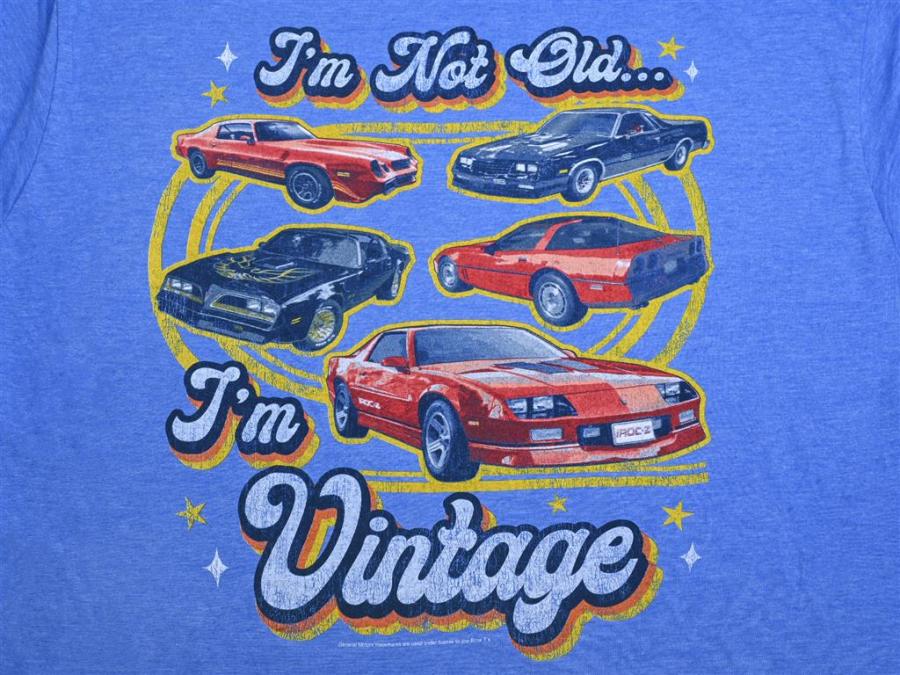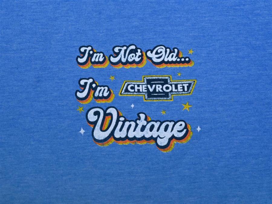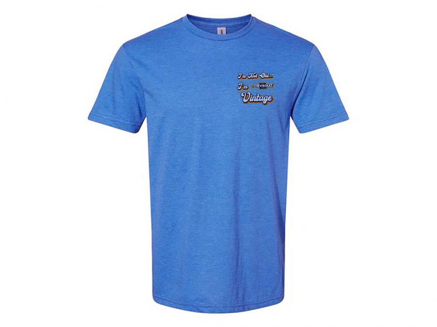 Adult Heather (65% Polyester, 35% cotton) Royal T-Shirt with I'm Not Old I'm Vintage with Chevrolet Bowtie on left front chest, and 5 cars silk screened on the back.