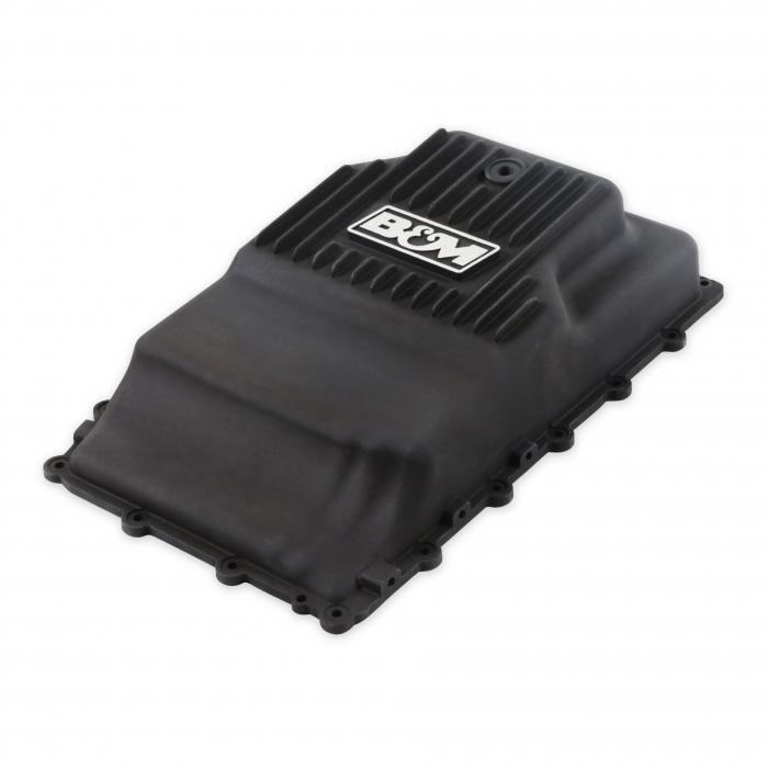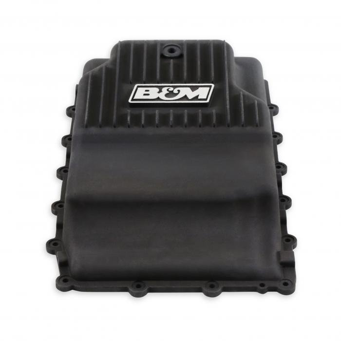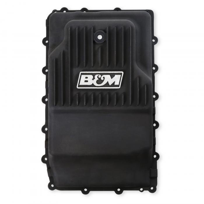 Our Hi-Tek deep transmission pans are constructed from A356-T6 aluminum and are cast with thick internal and external fins, adding additional strength and increased cooling properties. The deep pan design increases fluid capacity by 2 quarts over the stock O.E. pan. All these features combined help dissipate heat quicker netting lower transmission and fluid temperatures and prolonging the life of your transmission, transmission fluid, and corresponding components. Other features of this popular pan include a drain port with a magnetic drain plug for clean and easy servicing. Also includes a 1/8-inch NPT temperature sensor port for easily adding a temp gauge for monitoring transmission temperatures while daily driving, towing, or racing. Includes detailed instructions with all necessary hardware for an easy at-home installation. Note: 10R80 transmissions do not come with a dipstick from the factory to check the fluid level. As a solution, B&M offers an optional locking dipstick part #22200 to measure transmission fluid level. Also available in a natural finish (B&M Part #70400).