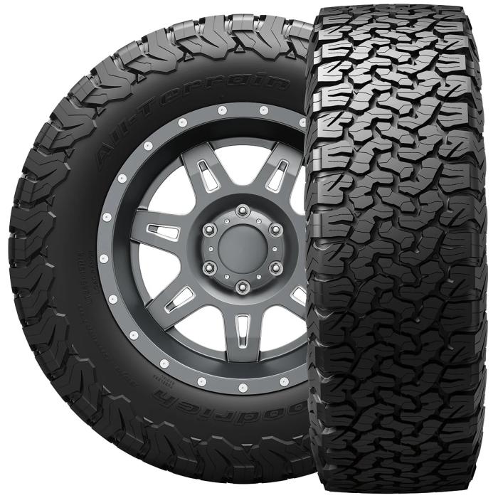 • BF Goodrich All Terrain T/A KO2 tires are drop shipped. Please allow additional shipping time. Tire mounted on wheel for demonstration purposes only. Wheel and other accessories are not included. Please note that dimensions listed (tread width, section width and overall diameter) are non-scientific and based on an inflated tire, mounted to a wheel. Dimensions may vary due to rim width and inflation pressure.