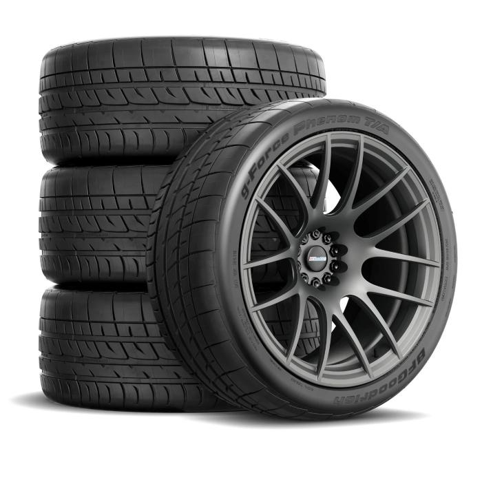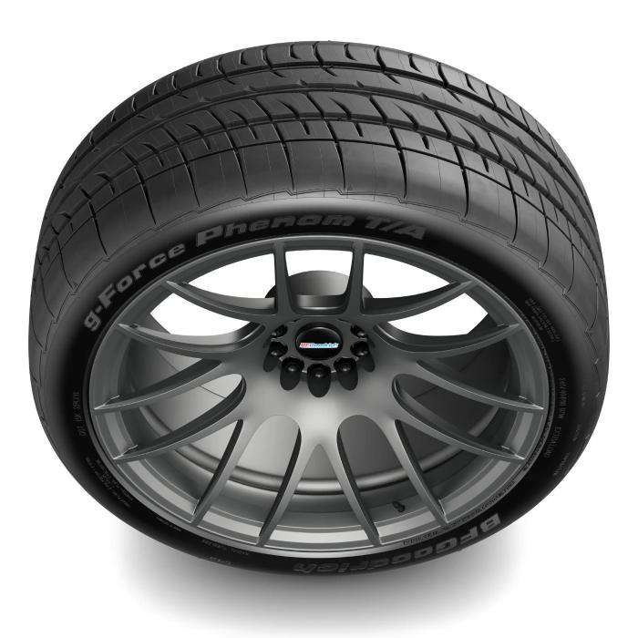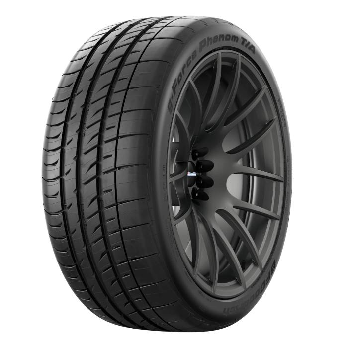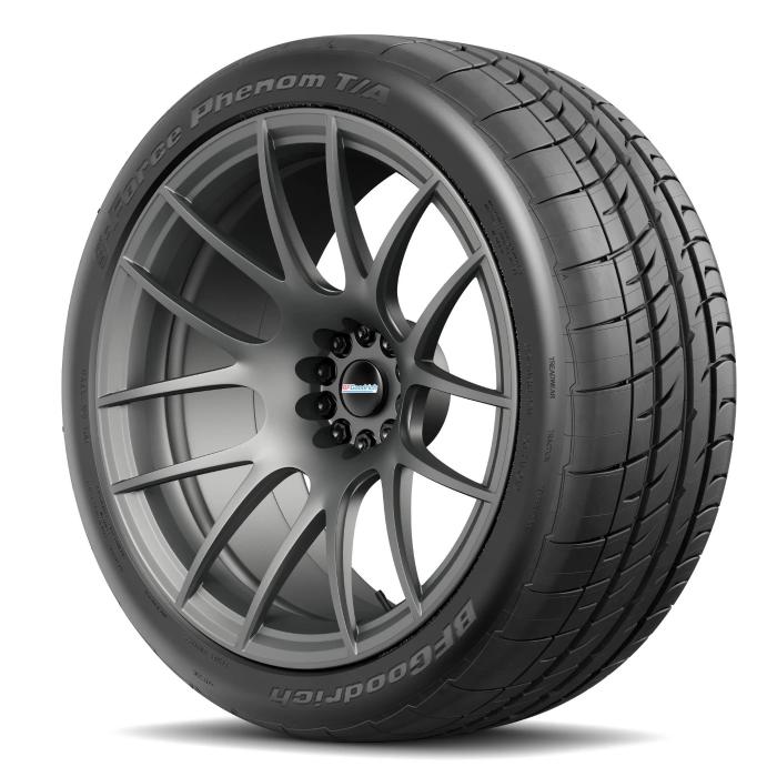 • These BFG Phenom T/A tires are drop shipped directly. Please allow additional shipping time. Tire mounted on wheel for demonstration purposes only. Wheel and other accessories are not included. Please note that dimensions listed (tread width, section width and overall diameter) are non-scientific and based on an inflated tire, mounted to a wheel. Dimensions may vary due to rim width and inflation pressure.