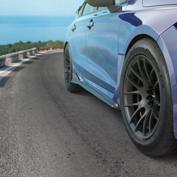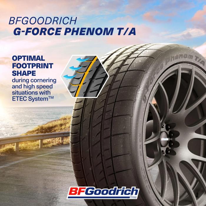 Confident spirited driving on dry and wet roads. g-Force Phenom T/A tire's dual zone tread design features an optimized wet zone for water evacuation and a dry zone for maximum road contact for ultimate confidence and control. The BFGoodrich g-Force Phenom T/A tire has better wet braking distance than the Yokohama ADVAN Apex V601 tire and other leading competitors.