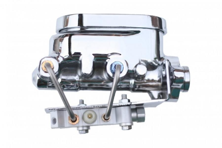 New 1-1/8" bore chrome flat top power brake master cylinder and 4 wheel disc brake proportioning valve. This kit is a nice clean way to add a power brake 1-1/8-inch master cylinder with the correct proportioning valve, mounted for that factory look.