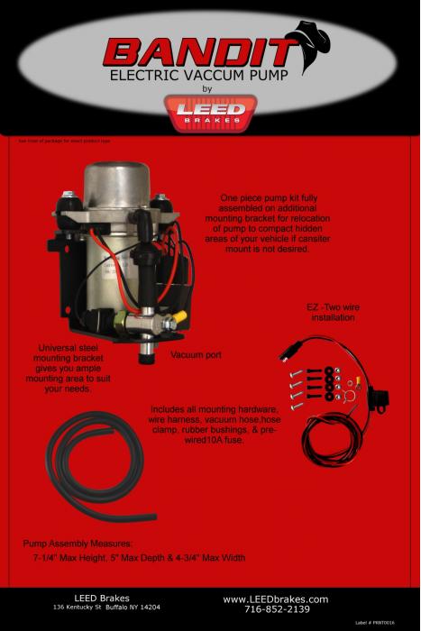 Leed Brakes rotary electric vacuum pump kit. Provided 24 inches of quiet reliable vacuum for the power brake booster on vehicles with low engine vacuum. Easy 2 wire installation. Includes all hardware, hose and detailed instructions.