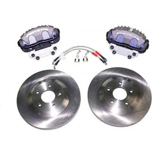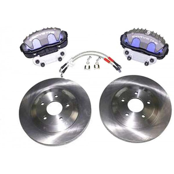 Give your C4 "stop on a dime" capability with C5 front brakes. It provides a 25% bigger pad plus the rotors are 11% lighter than the C4's 13" big brake package! The kit includes GM, Corvette twin-piston front brake calipers, 13" sport brake rotors, Hawk high performance HPS brake pads, stainless steel flex brake hoses (Conforms To Federal Motor Vehicle Safety Standards No. 106), all necessary mounting brackets and hardware plus easy-to-follow installation instructions. Note: This kit must be used with ZR1, Grand Sport or equivalent aftermarket wheels.