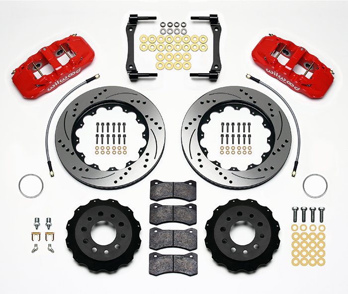 AERO4 Big Brake Rear Axle Kits replace the factory disc brakes and use the OE parking brake assembly as a compliment to front big brake upgrades on late model high performance vehicles. High capacity braking from the W4AR calipers, BP-10 compound pads, and oversized 14.00" rotors are matched to the OE master cylinder output, ABS function, and individual vehicle bias requirements. Enhanced brake performance, increased durability, and high-tech style compliment big wheel, tire, and suspension upgrades on customized vehicles and all others with increased brake requirements.