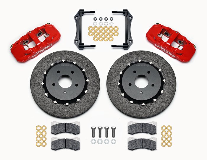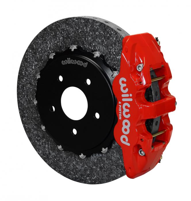 AERO4 WCCB Carbon-Ceramic Rotor Rear OE Parking Brake Kits offer an extreme performance upgrade featuring WCCB Carbon-Ceramic Dynamic Mount Rotors with Wilwood’s exclusive Bobbin Mounting System. AERO4 WCCB kits are engineered to maximize braking capacity inside custom wheels. Rear parking brake kits offer a simple bolt-on installation with OE original internal shoe parking brakes for outstanding holding power and are fully compatible with ABS and OE master cylinder output. AERO4 calipers are a competition proven and offer fully detail machined forged caliper body demonstrates superior strength and resistance to deflection and separation under high load. A high temperature, fluid resistant “Quick-Silver“ Nickel plate is the standard for performance, other colors (Black and Red powder coat) are available as options. 14.00” WCCB rotors are made from a proprietary blend ceramic matrix composite material commonly known as Carbon-Ceramic and dynamically using Wilwood’s proprietary integrated anti-rattle Bobbin Mounting System. WCCB rotors offer higher thermal conductivity and heat capacity in excess of conventional iron or titanium rotors of similar or even greater weight and have been developed to withstand extreme temperatures with the highest possible degree of resistance against distortion, warping, cracking and wear.