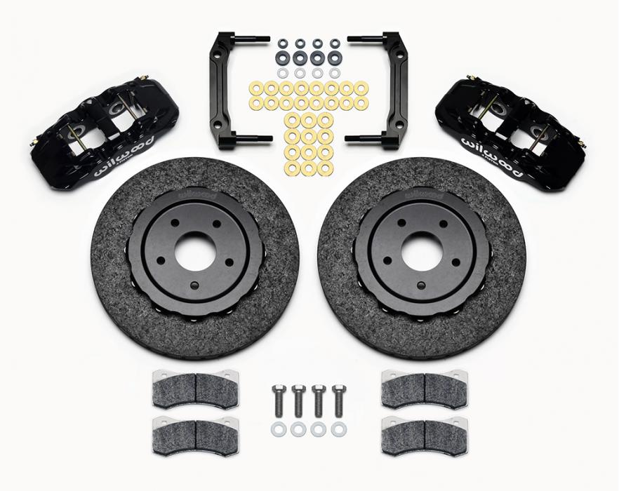 AERO6 WCCB Carbon-Ceramic Rotor Front Brake Kits offer an extreme performance upgrade featuring WCCB Carbon-Ceramic Dynamic Mount Rotors with Wilwood’s exclusive Bobbin Mounting System. AERO6 WCCB kits are engineered to maximize braking capacity inside custom wheels. These brake kits offer a simple bolt-on installation with minor modifications required to the front spindle only and are fully compatible with ABS and OE master cylinder output. W6AR calipers are a competition proven and offer fully detail machined forged caliper body demonstrates superior strength and resistance to deflection and separation under high load. A high temperature, fluid resistant “Quick-Silver“ Nickel plate is the standard for performance, other colors (Black and Red powder coat) are available as options. 14.00” WCCB rotors are made from a proprietary blend ceramic matrix composite material commonly known as Carbon-Ceramic and dynamically using Wilwood’s proprietary integrated anti-rattle Bobbin Mounting System. WCCB rotors offer higher thermal conductivity and heat capacity in excess of conventional iron or titanium rotors of similar or even greater weight and have been developed to withstand extreme temperatures with the highest possible degree of resistance against distortion, warping, cracking and wear.