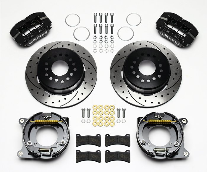 Forged Dynapro Low-Profile Pro-Series rear disc brake kits provide a complete solution for popular muscle car rear axles on applications that require a parking brake assembly and extra clearance for 14.00” to 15.00” rim applications. Forged billet Dynapro Low-Profile four-piston calipers 11.00” one-piece hat and rotor assemblies, and high friction pads provide optimized and balanced braking for all types of custom performance street/strip and show machines. The neatly hidden internal shoe system provides a clean installation with superior static holding power for parking. Optional caliper finishes and rotor designs enable the builder to personalize the style and optimize brake performance for every individual application.